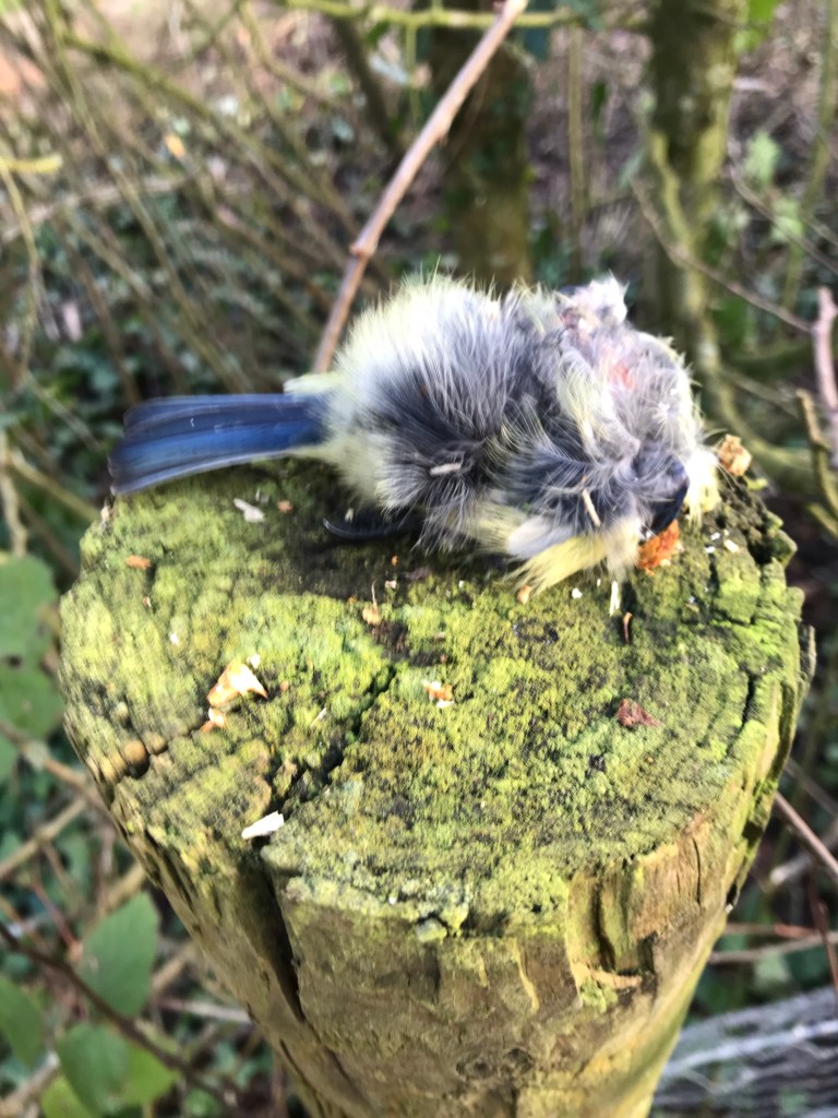 n.b. Unusual for prey to be left almost whole on a plucking post. I must have scared the predator off while working on the hedges.