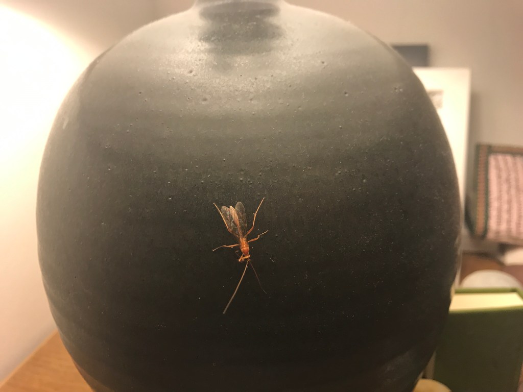 This insect sat on the lip of the lampshade for a while cleaning its antennae, almost like a cat would clean its whiskers.