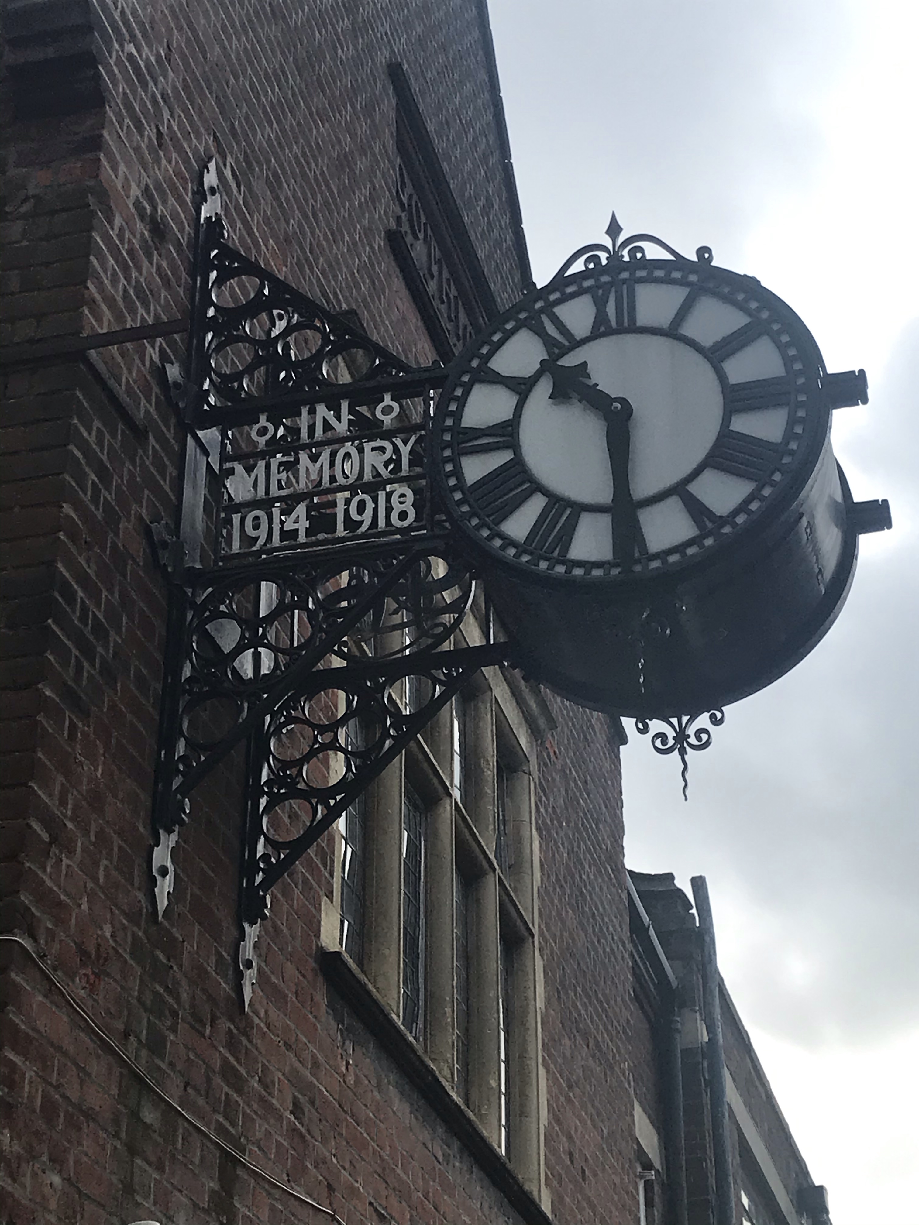 Around the corner there is a freshly laid wreath, with paper poppies still luminous red, positioned underneath a memorial plaque and clock on an old factory wall. There are 33 names on the plaque. The dates for The Great War in which these fellow workers were killed is given as 1914 ~ 1919.