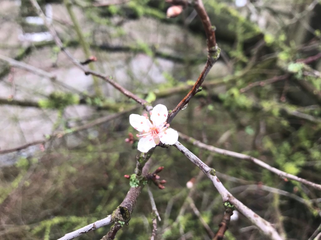 At Costessey a cherry tree has the first of its delicate pink-tinged white flowers open. The other small flowers are like tiny balls of snow, but are about to unfold. The morning is mild; perfect for cycling were it not for the flooded roads.