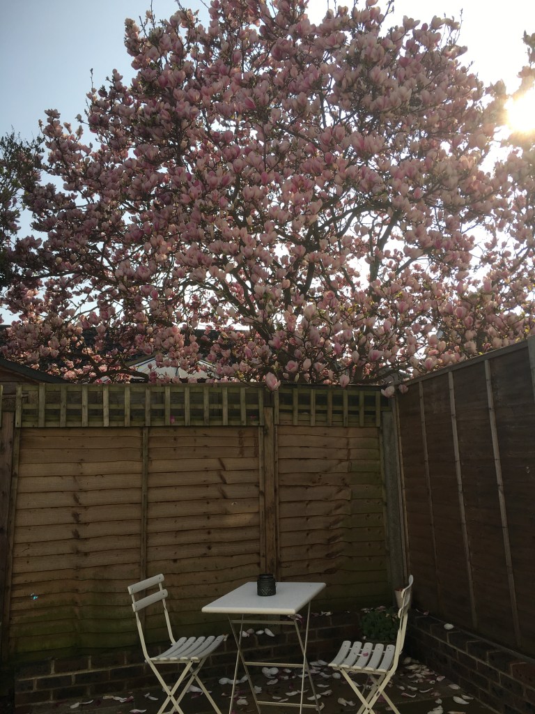 I agree with Jane and Arti. I love how you captured the warmth of late August with so few words in the patio paving and tanned feet, Chris, and the contrast between the two stanzas of sun and shadow. The blackbird hidden by blossom is a bonus.