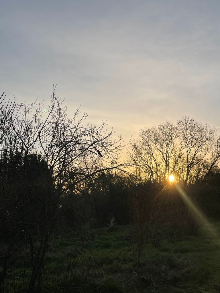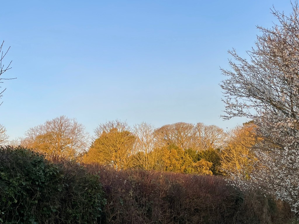 A Green Finch makes its presence felt from the silver birch with its repeated, sustained, low-key screeches. The laugh of a Green Woodpecker stretches out across Peace Field, then again toward the developing woodland, down to the north side of the site. Then Blue Tits in twittering pairs, flitting along and through the hedges. As the Sun emerges fully from below the hill, a Robin launches into an extended melody, then as if as a counter-point, a Dunnock throws out several verses of its own.