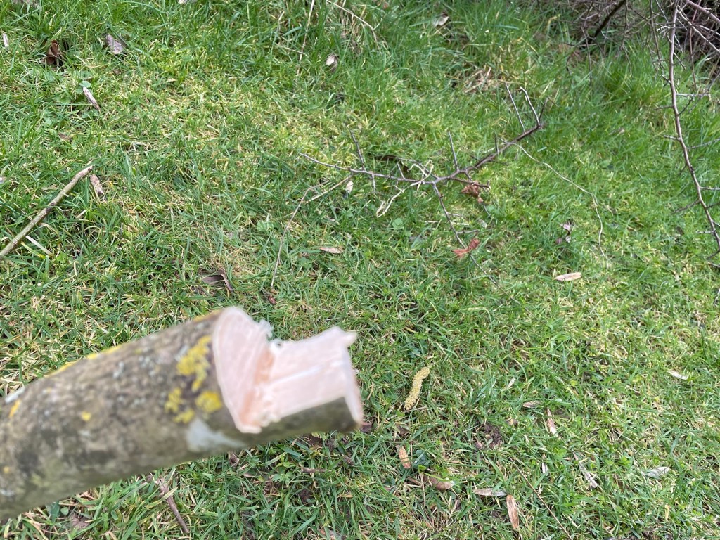 Besides the gentle focus on the work and the brief bursts of the pruning machine, there is no more birdsong audible today. The early sunshine, turned milky as thin cloud thickened, then settled as total cloud cover. A permanent sense of twilight, a falling temperature, with a suggestion of imminent rain, dampened the lively spirits of the birds. Only a chirrup here and there from a hedge, or a brief burble from the nearby chicken coop was heard. A Robin flits silently curiously on the piles of pruned branches and hedge cuttings that has been accumulating since the year began. It watches what is going on from one of the piles, then moves onto another to keep a beady eye on the clearing work.