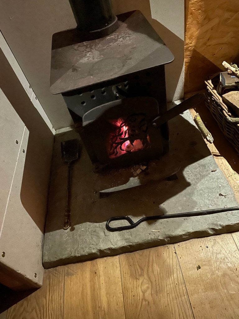 Inside the cabin, the noise comes from the wood-burner, when a burnt-out log falls into the embers. Silence to all intents and purposes, except for an owl out there, somewhere.