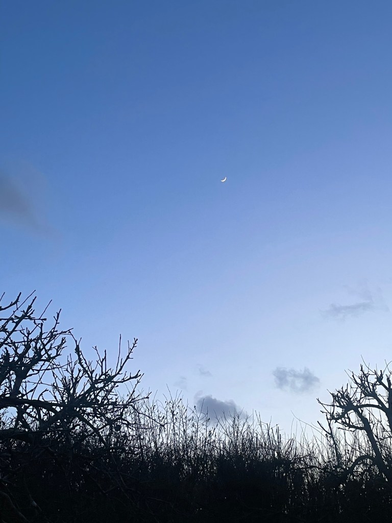 At 6 p.m. it was still light enough to complete the task of dragging the hedge and bay tree cuttings away. The first fine slice of the Moon was visible as I caught up with Smiley, who is the epitome of good nature. He is as he describes it, a Soul Mid-wife, which means, an end of life counsellor. Working with those living on short-notice and their families before and after death of the beloved is heavy work, but Smiley’s belief in passing to the spirit world, as opposed to simply becoming just so much more compost, provides invaluable comfort to the people he supports.