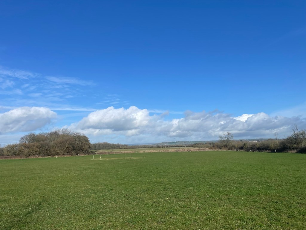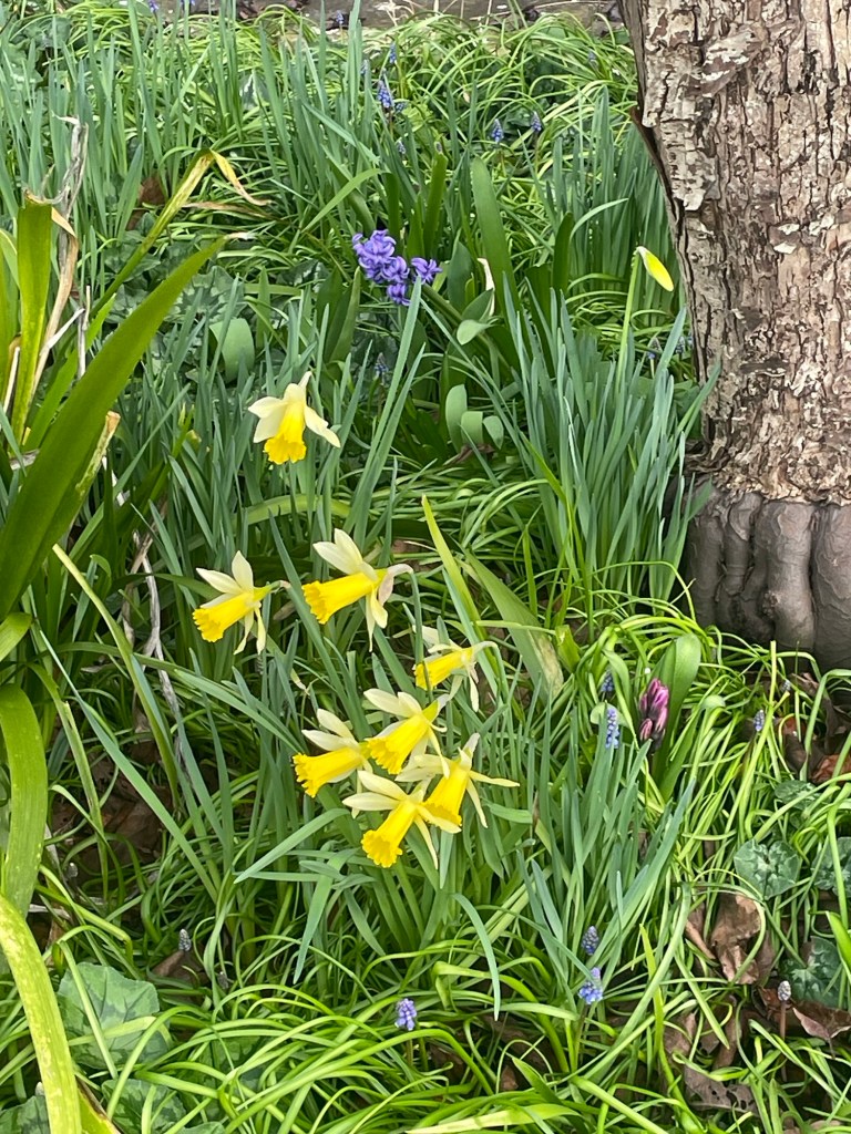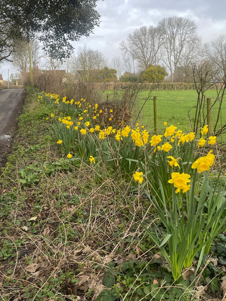 Last week was schools’ half-term, so with their return to work today, local traffic has been much heavier. The area has seen a lot of new housing built since my last visit, with the resultant additional car movement. It is harder and harder to escape the noise of motor vehicles in this part of the country, because if you live in villages, or down lanes, a car, or van, or tractor, is essential. Yesterday, for much of my walk on Polden Way, the background hum of cars was something that the birds had to compete with as they enjoyed the sunshine. The sunshine was very welcome and persuaded a bank of daffodils near the permaculture garden to open up in full.