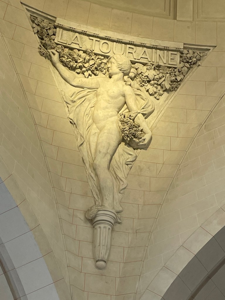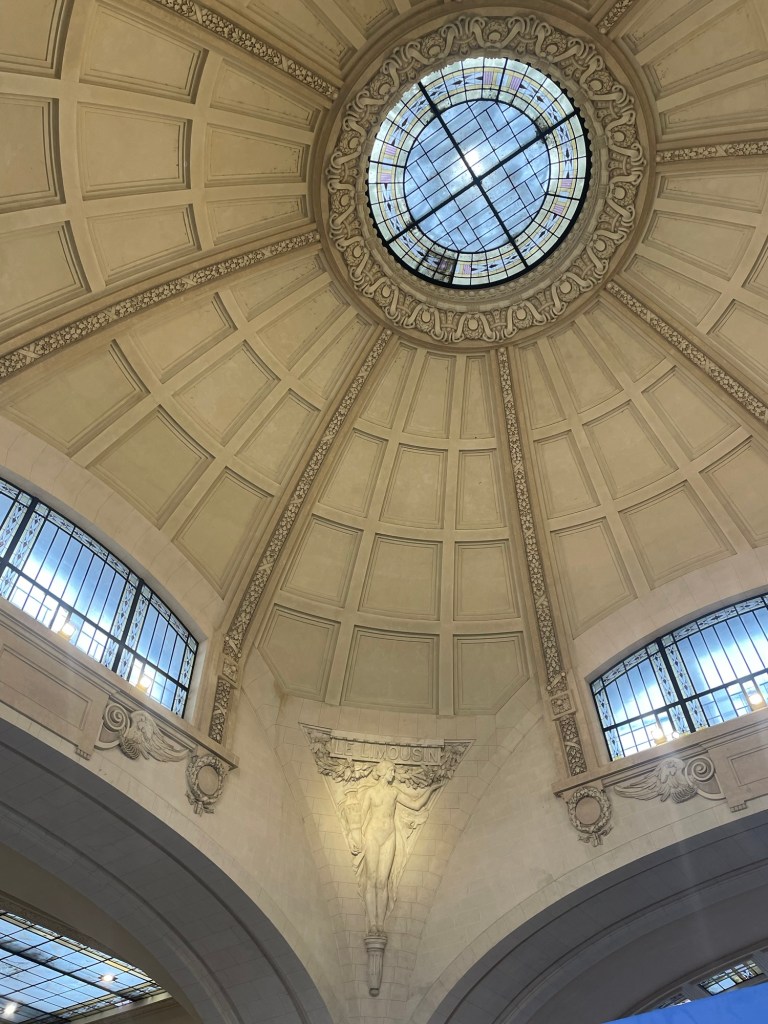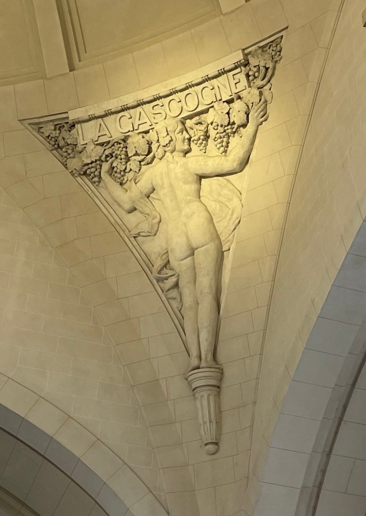 The dome ceiling curves down into four stone female figures who are meant to represent four regions served from the junction. Only in France is the feminine form so freely presented in its public statues.