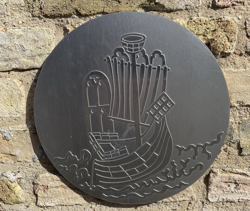 I was rather taken by this piece of art. This image of a ship traversing a choppy sea, was on a wall near the Guildhall, I think. Note the empty crow’s nest and the absence of crew from the scene. Is it just an emblem, a reproduction of a coin or trading token of some kind?