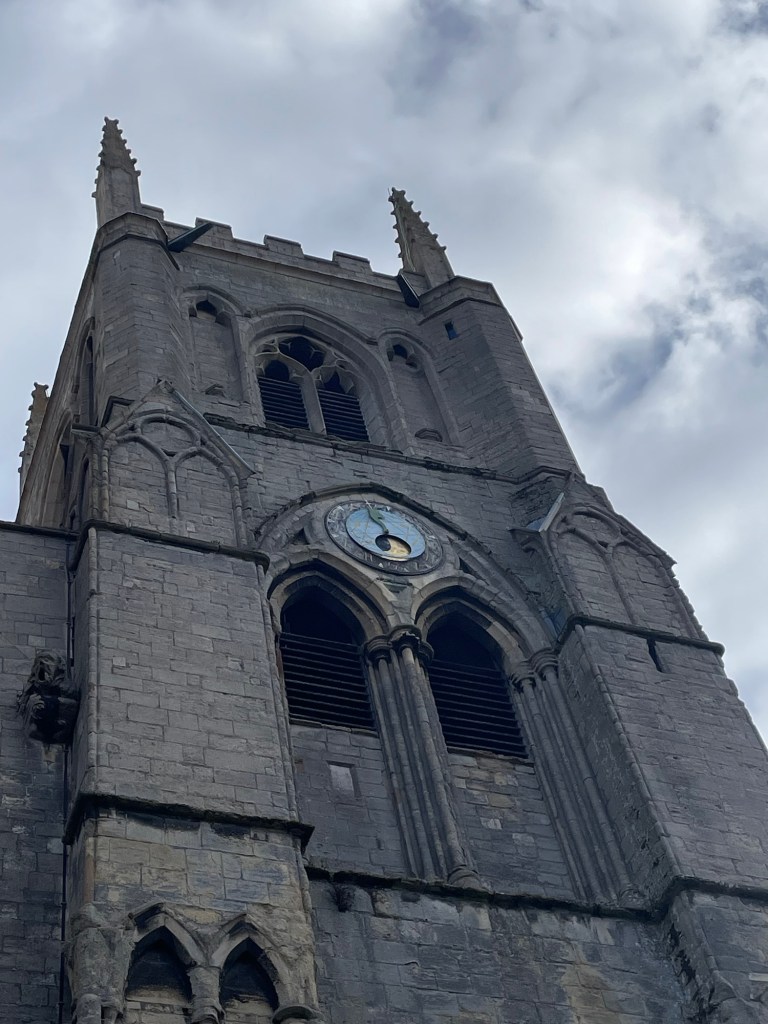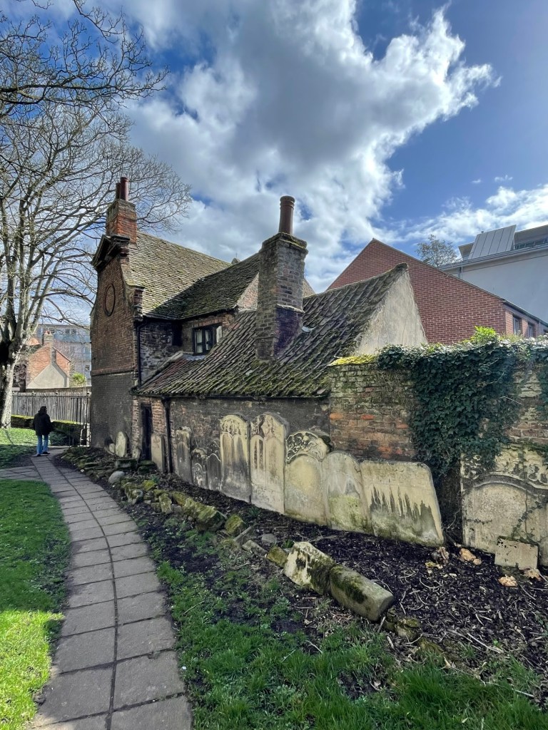 After catching up with my beloved, who had been delving into charity shops, we went to look around the precinct of St Nicholas Chapel. It is big for a chapel. At some point somebody deemed it would be a good idea to add a spire to the stone tower, in this riverside port that lacks a solid underlying geology. The stone tower shows signs of stress. While not buckling completely, the weight of the spire is gradually compressing the tower’s stonework. I think the chapel’s spire is the tallest structure in the town, how long it will remain so can only be guessed.