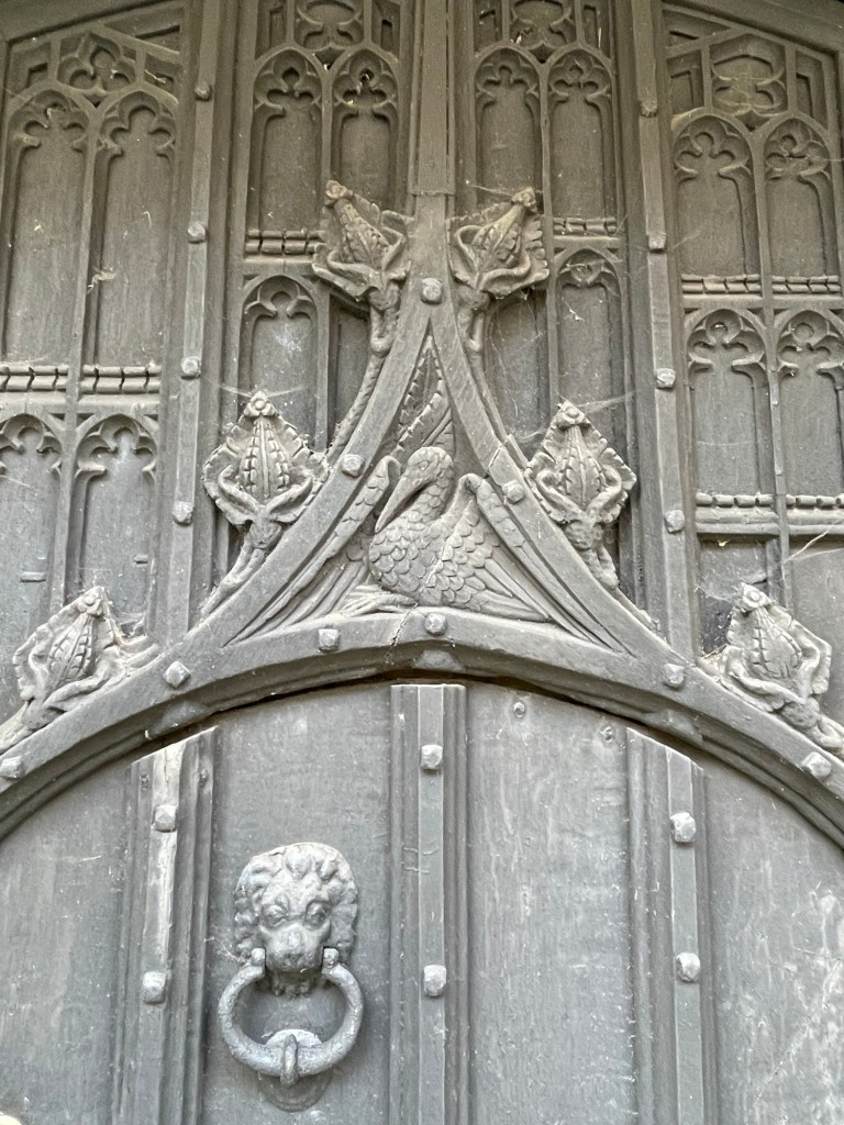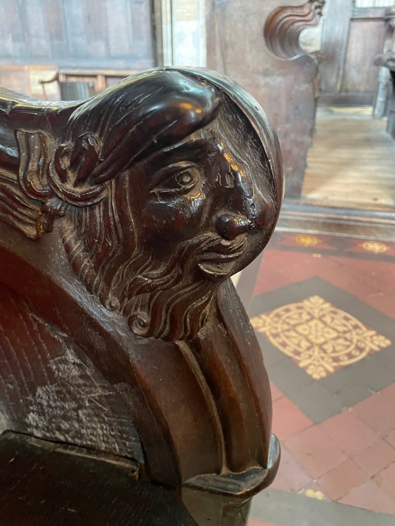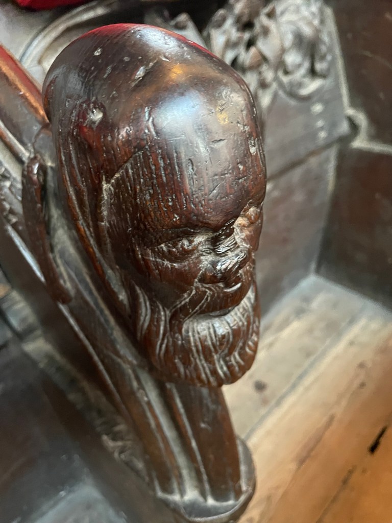The building had suffered some damage during the English Revolution of 1642 – 1649, although stained glass remains a feature, casting the noon sunlight in pleasing patterns on the floor of the nave. The choir stalls feature carvery of various heads, some more worn than others.