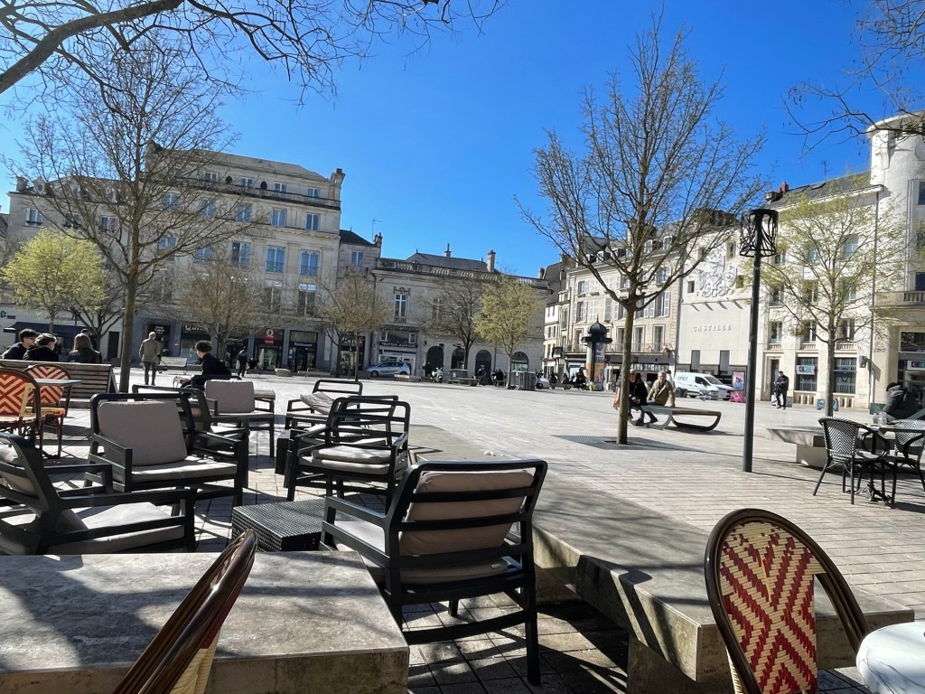 In the large public square, in front of the Hotel de Ville, numerous tables are set for lunch outside the row of cafés to my left. I chose one at Café du Commerce and order a café au lait. There are only a few tables being used, more by the café door.